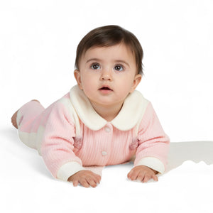 • A Ribbed Button-Front Jacket: This cozy top features an easy-to-use button-front closure, a classic contrasting Peter Pan collar, and soft cuffed sleeves. It is decorated with delicate, embroidered star (or flower) appliques. The stylish two-tone color blocking adds a modern, sophisticated touch.
